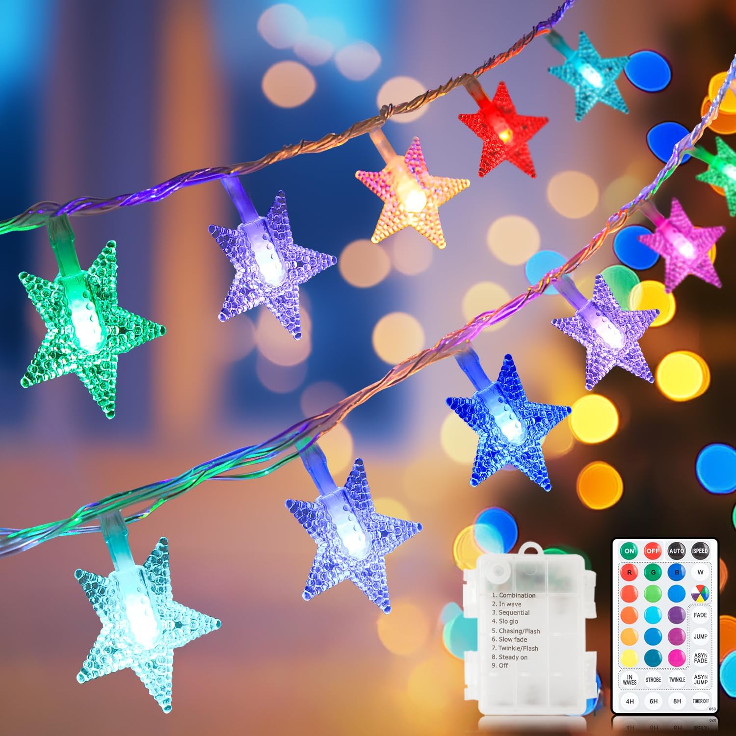 • Battery Powered Star String Lights: Easily power these Star string lights with 3 AA batteries (not included), making them perfect for both indoor and outdoor use. Control the lights with the included remote to switch between 8 lighting modes, adjust changing speed, and set timers. Perfect for adding a cozy ambiance to your bedroom, classroom, or any space.