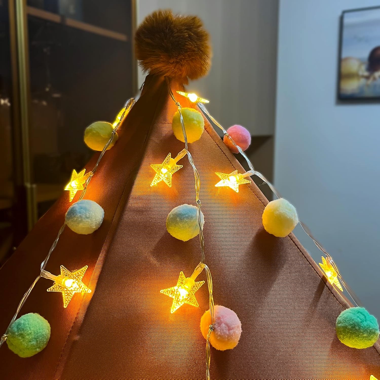 - ⭐CUTE POMPOMS STAR LIGHTS: Cute simple 6.56 feet string lights with 20 pompoms balls and 20 plastic warm white star lights, create cozy and romantic atmosphere, spicing for your decor.